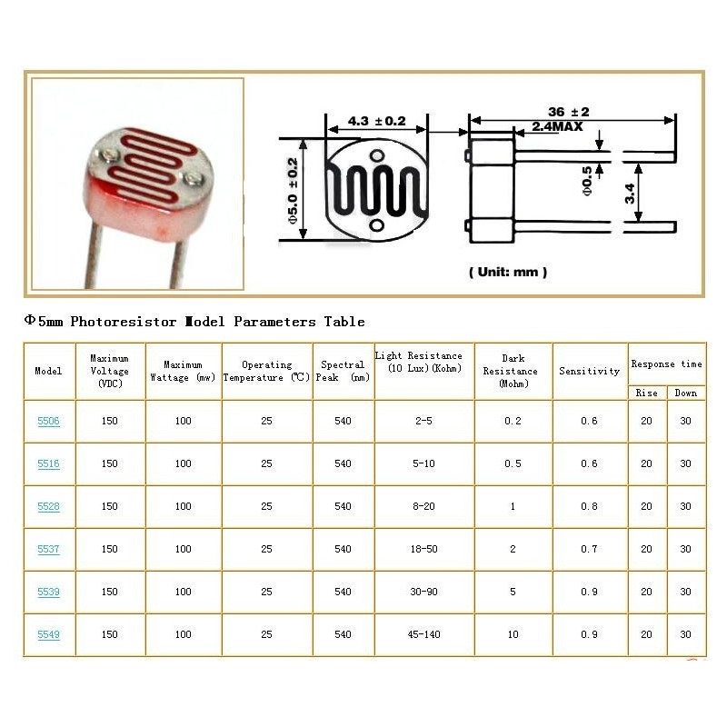 Bright resistance (10Lux) (KΩ): 5 - 10