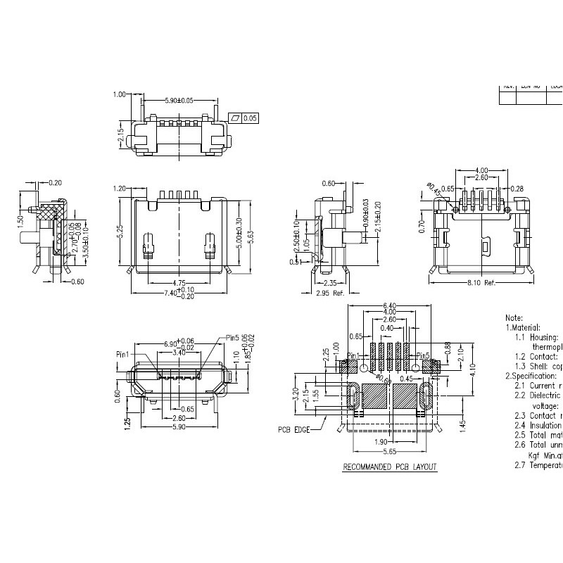 Connecteur micro USB B femelle a souder (fixation 2 points 90°)(5 pattes courtes pour l'USB)