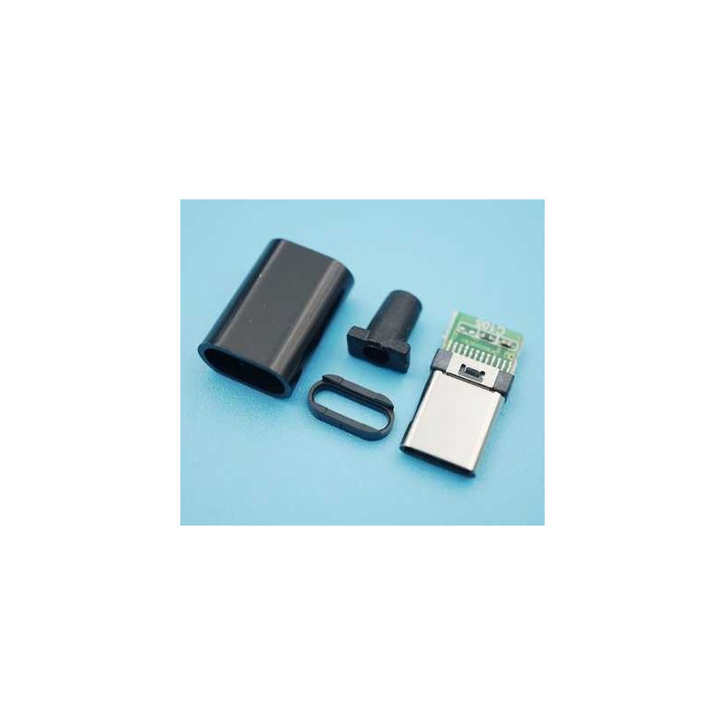 Connecteur mâle USB constitué de deux demi-coquilles en plastique et d'un connecteur USB mâle à souder sur fils.