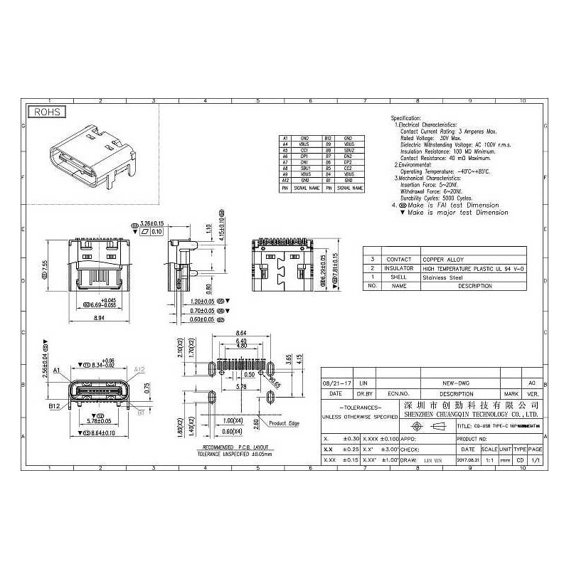 Connecteur Femelle USB Type C a souder SMT fixation 4 broches verticales